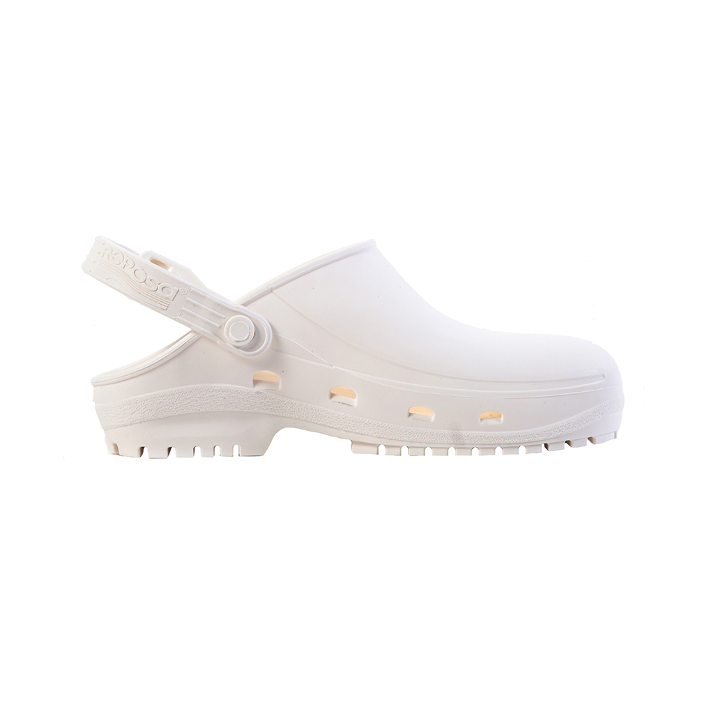 Dispone de una banda de rodadura SRC reforzada y antideslizante. Tiene una parte superior cerrada para evitar el contacto con sustancias orgánicas o nocivas, pero tiene ventanas laterales para la ventilación del pie y el escape del vapor durante el autoclave. La posibilidad de esterilizar Reposa Max lo convierte en el calzado ideal para quienes trabajan en hospitales, donde las necesidades de higiene son máximas y un aspecto imprescindible.